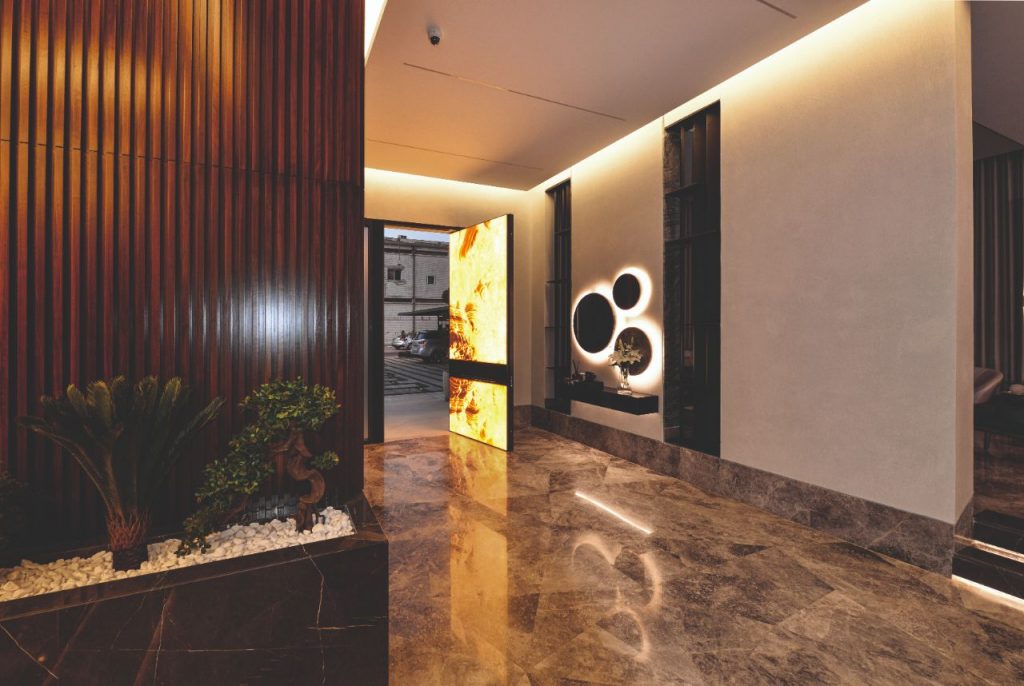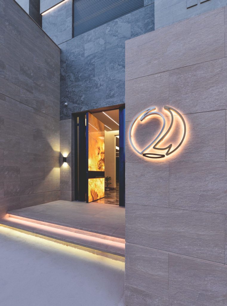 The Oikos Synua door with its backlit onyx finish makes a great impression at this home in Kuwait.