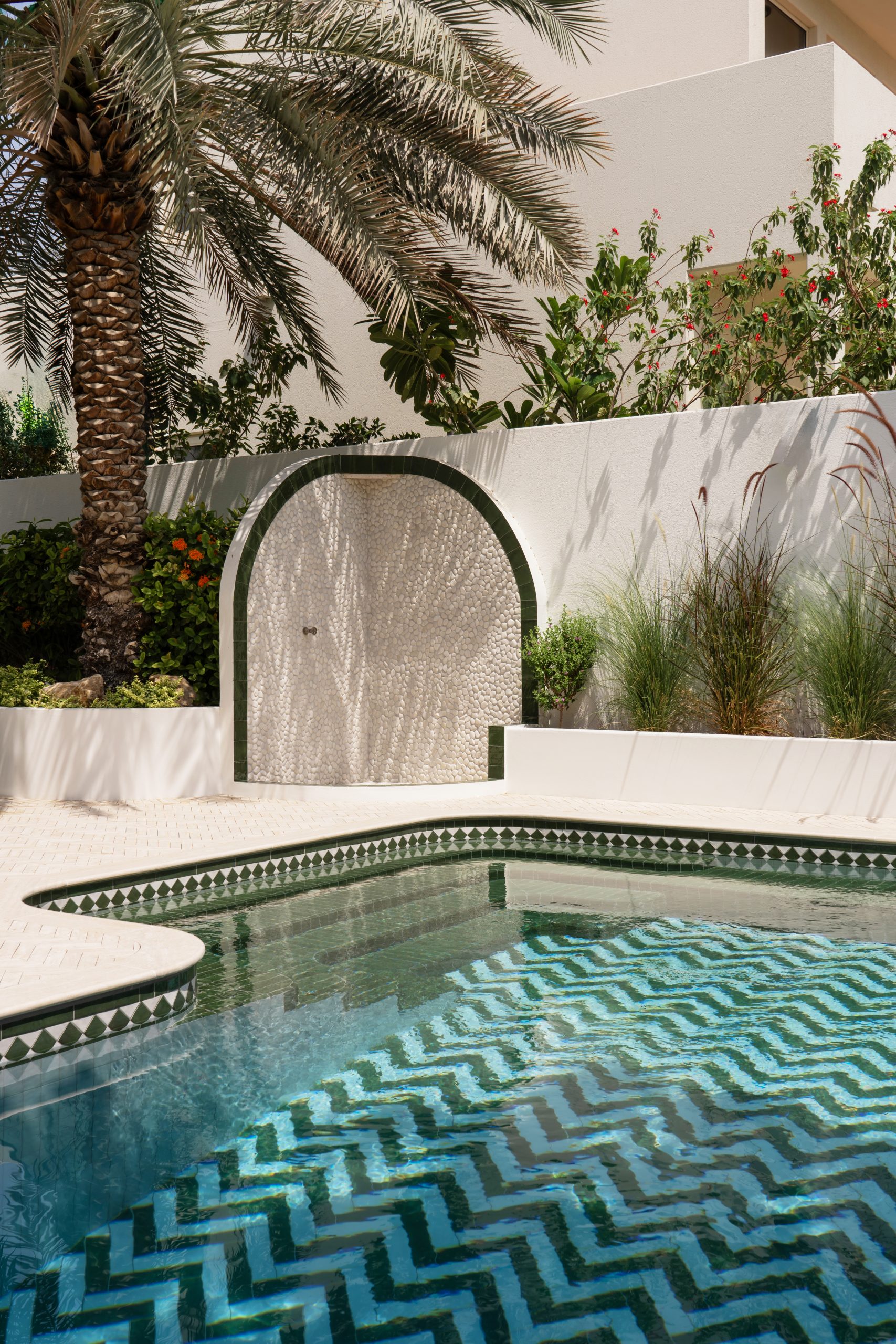 Fayenza by the pool: Handcrafted by APE Grupo for an elegant Dubai project. Design: Astrid Peacock | Execution: Pools by Design | Photograph: Casa Mia Visuals