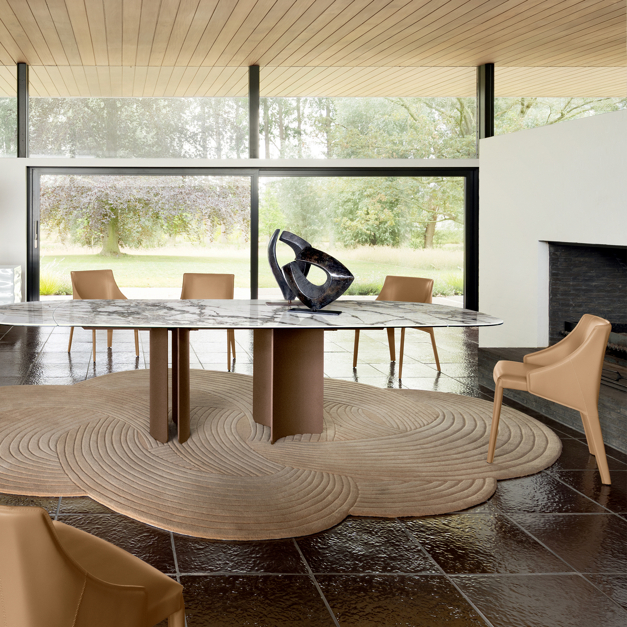Designed by Maurizio Manzoni, Deltalis is a stunning fixed oval dining table featuring a top in ceramic or glass composite. The crossbeam is made of aluminium and the base is formulated in steel with an epoxy lacquer finish that can be customised in various colours. Deltalis is offered in two dimensions