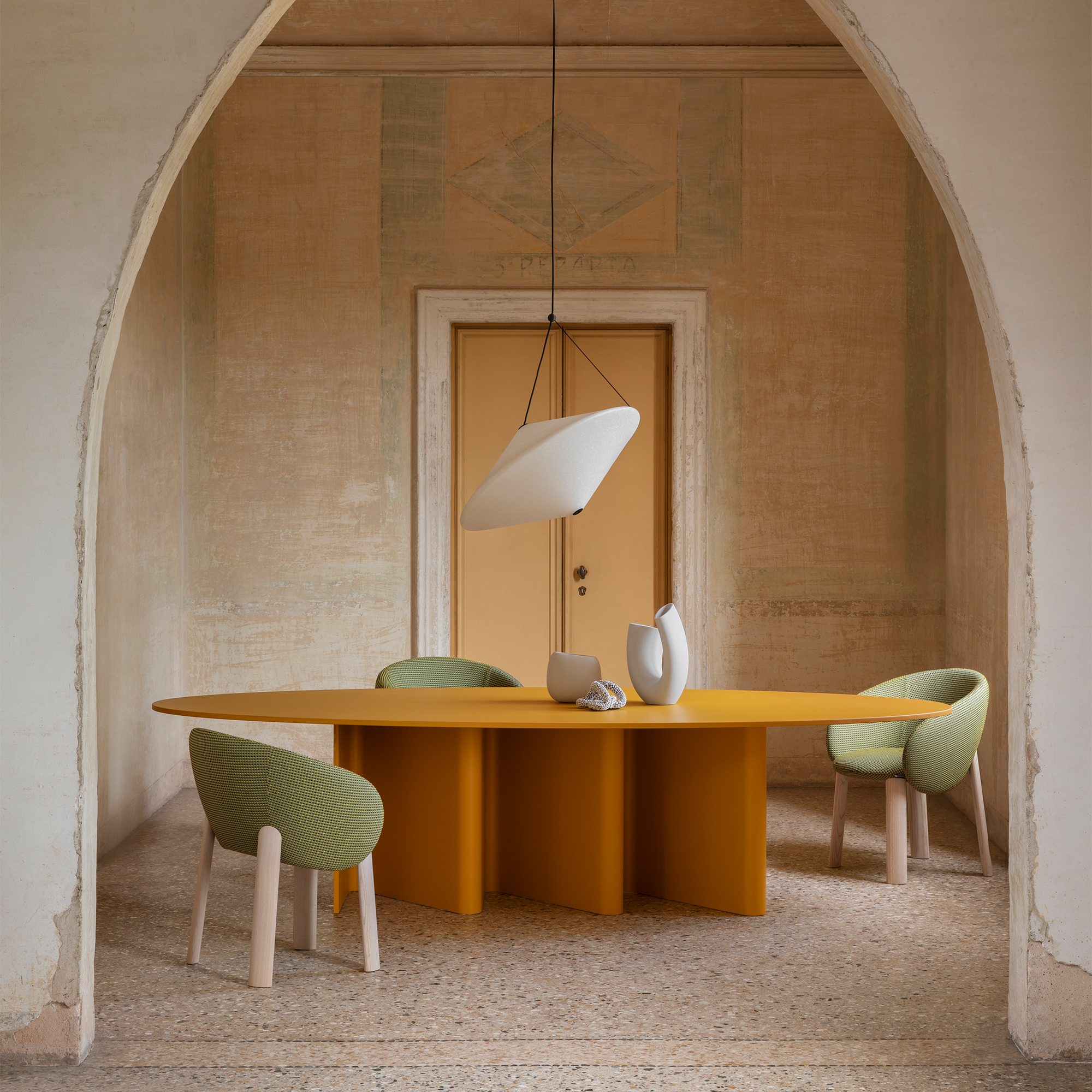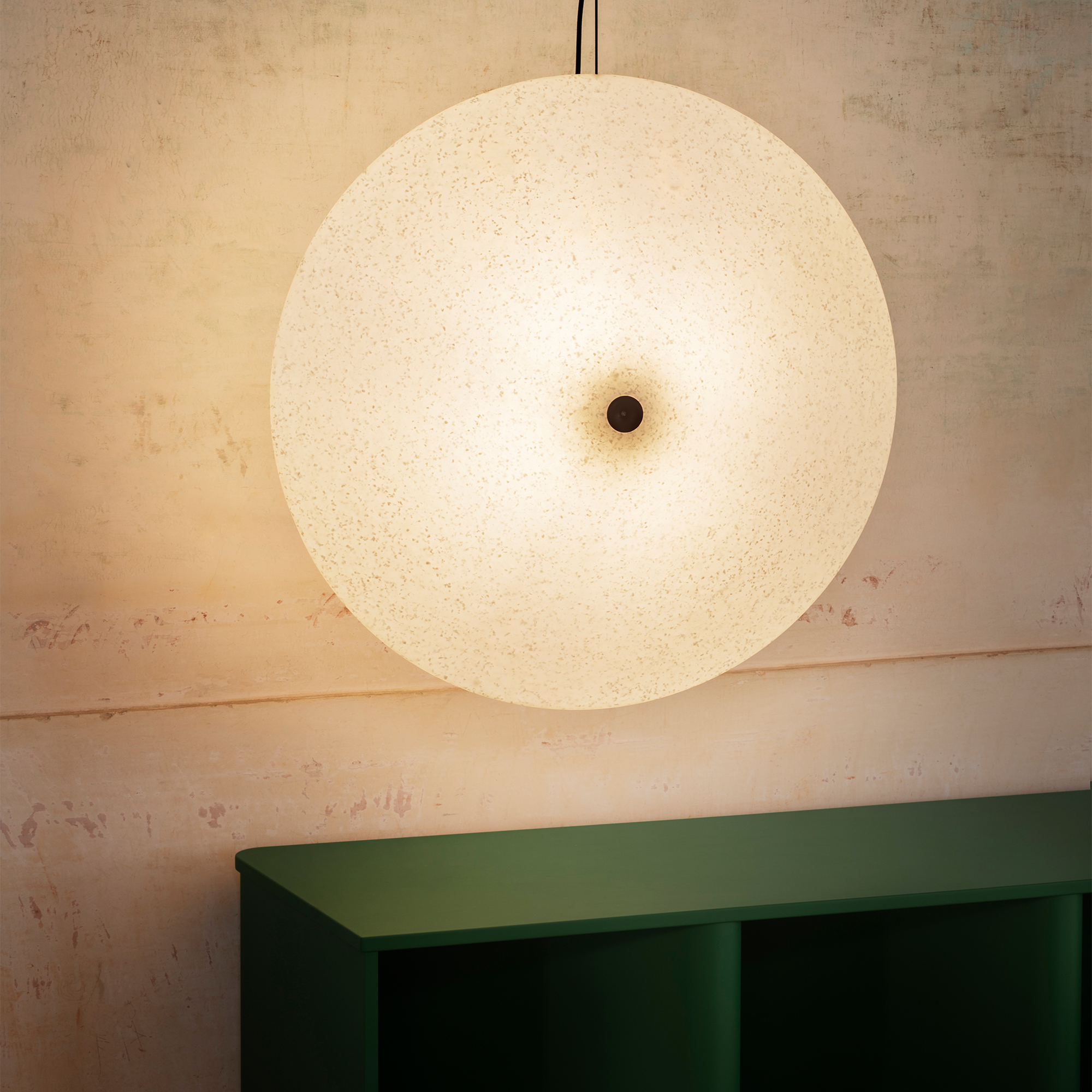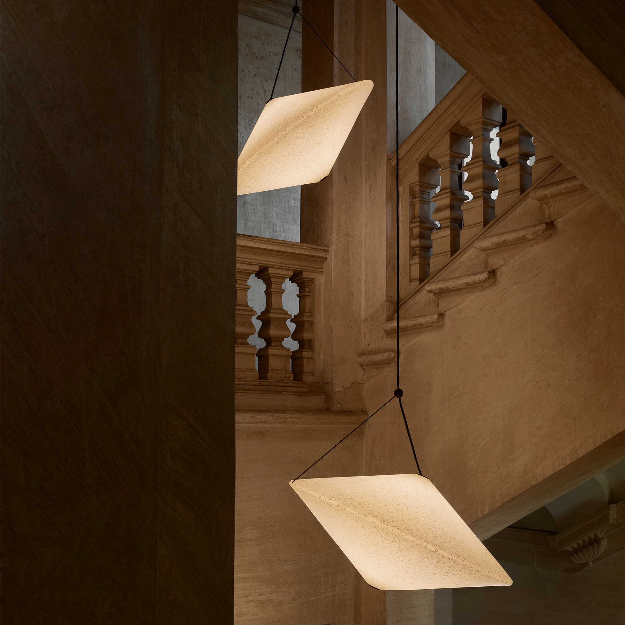 Crafted mainly from recycled polyethylene, Rificolona rotates in dialogue with the light, its density modified with a transparent spray. The lighting solution delicately hovers over the elements in a living space, tilting according to necessity or the light desired at any given time of day.