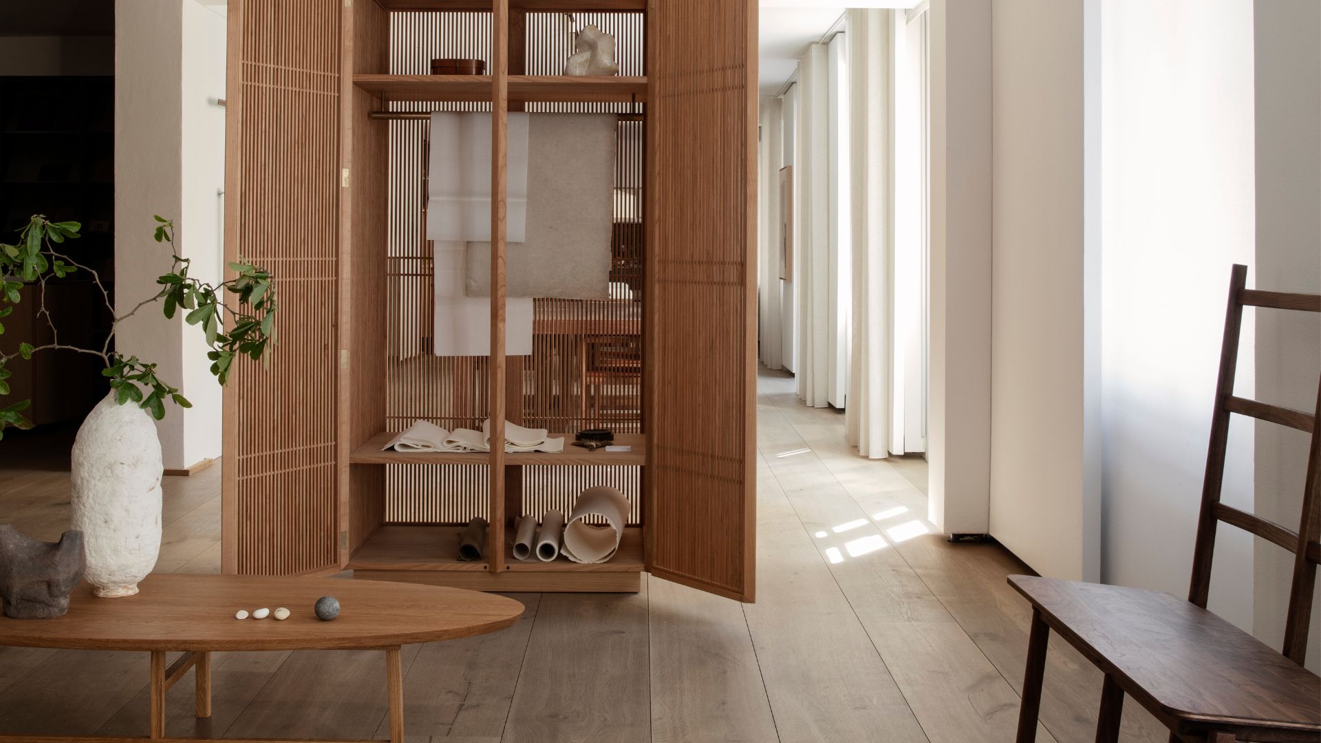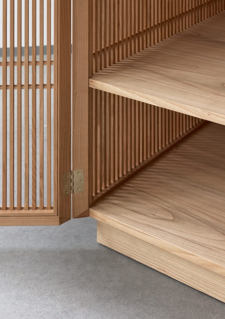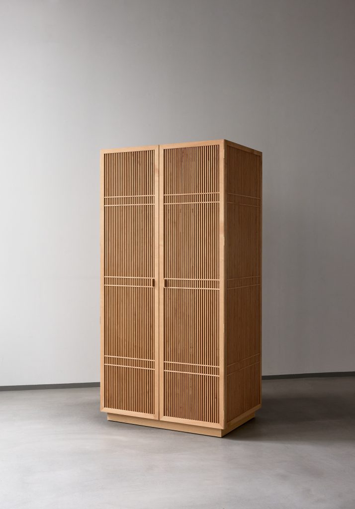 The latest addition to the Koshido series, the Koshido Armoire by Garde Hvalsøe is a freestanding showcase, crafted in solid cherry wood, features the distinctive Koshido front, developed in close collaboration with OEO Studio. Defined by refined detailing, natural materials, and a distinct architectural presence, Koshido Armoire brings together function and sculptural elegance. Its light construction of vertical wooden slats creates a subtle rhythm of light and shadow – a serene composition inspired by Japanese principles of balance, simplicity and spatial harmony, interpreted through a Nordic lens.