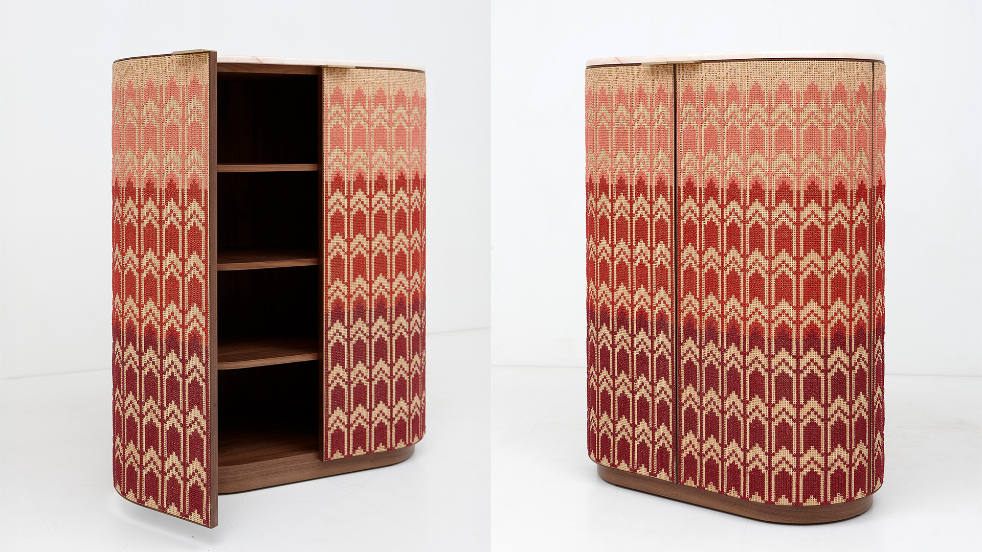 A long-standing emblem in Palestinian embroidery, Nakhla symbolises resilience, prosperity and a deep connection to the land. The motif is traditionally rendered in fallahi cross-stitch, a rural embroidery technique passed down through generations of women artisans from the Ramallah region. Reinterpreted by Debs, the piece hand-embroidered by the women of Inaash – a Lebanese non-profit dedicated to preserving traditional Palestinian embroidery and providing economic opportunities for Palestinian refugee women in Lebanon. The design carries a refined gradient of colour that lends a contemporary sensibility. A pink marble top introduces a material contrast, creating a quiet dialogue between past and present. The piece embodies continuity, craftsmanship and the enduring identity of the Palestinian people.
