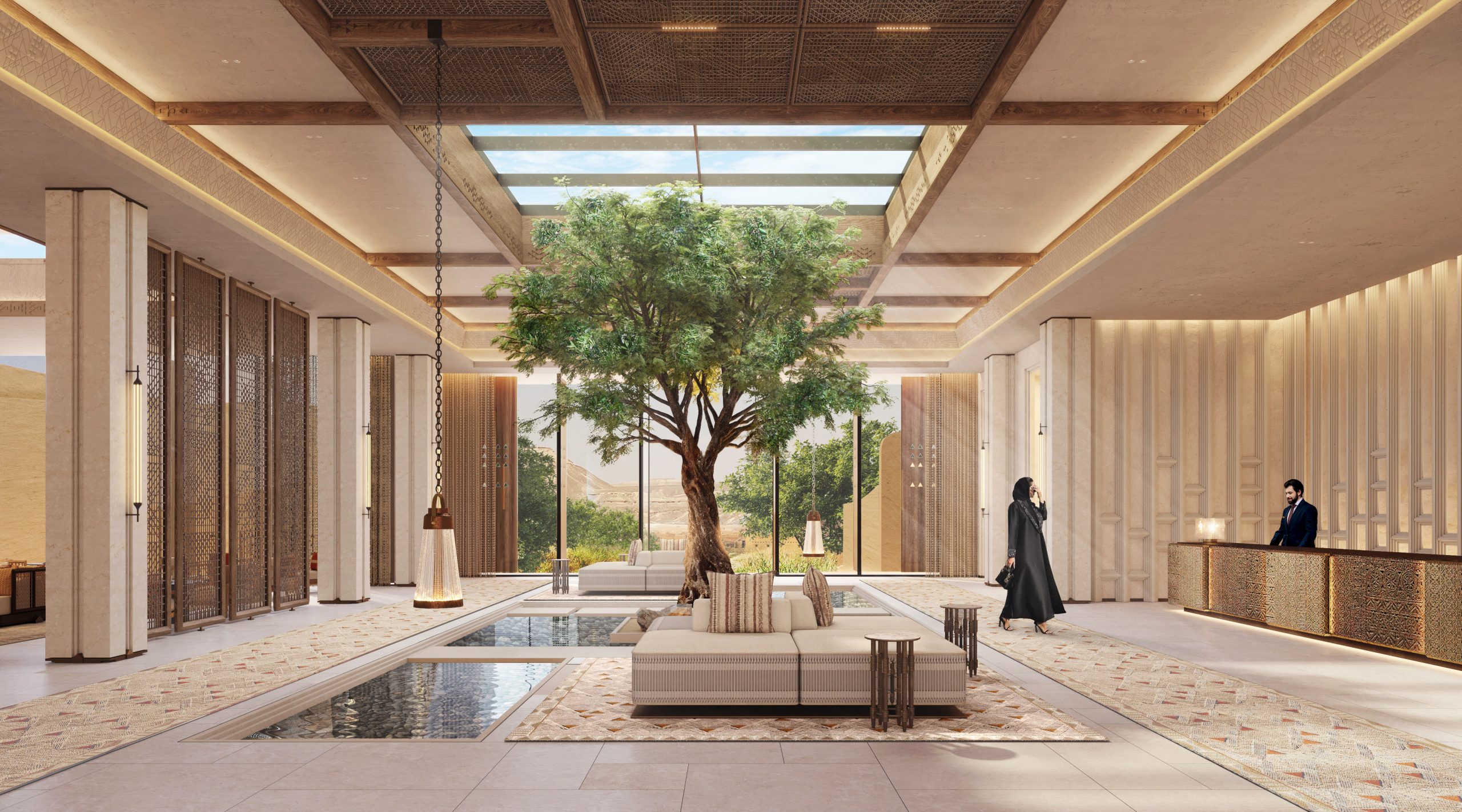 Upon entering the grand lobby, guests are greeted by the breath-taking panorama of the Wadi, framed by expansive glass walls that flood the space with natural light. A striking central feature – a serene water installation paired with a solitary tree – serves as a natural focal point, creating an atmosphere of calm that permeates throughout the hotel. The Chedi Wadi Safar’s all-day dining restaurant, crafted with an open, airy layout, draws inspiration from traditional Najdi architecture. The design features handwoven textiles, local limestone and intricate geometric patterns, providing guests with an authentic yet elevated dining atmosphere.