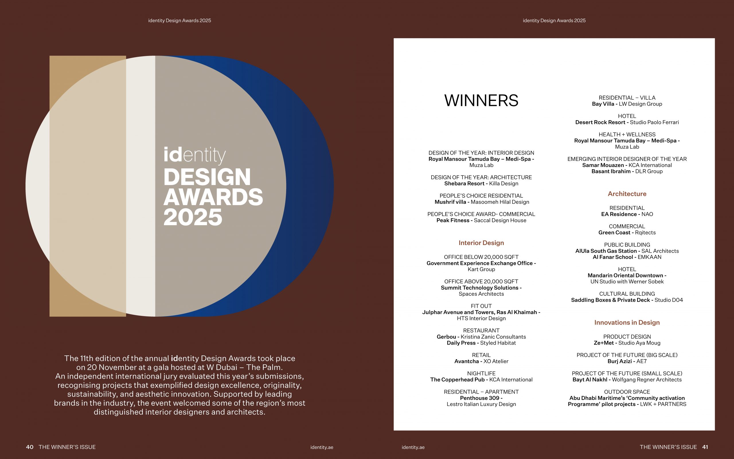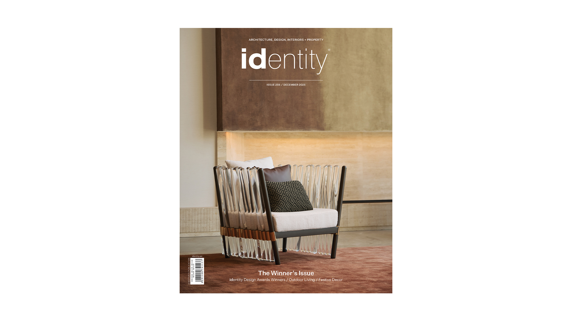 As we wind down toward the end of the year, it’s only natural to look back at all we’ve accomplished. Last month, the identity Design Awards took place at W Dubai – The Palm, and it was such a lovely reminder of why we do what we do. The warmth and ingenuity of the industry never fails to inspire; and celebrating the best of the best was a very special moment for us at team identity. Our sincere gratitude goes to our sponsors for helping us bring the awards to life with immersive, experiential settings that our guests genuinely loved. You can catch a glimpse of the glamorous night and view the esteemed winners and highly commended on pages 40-63.